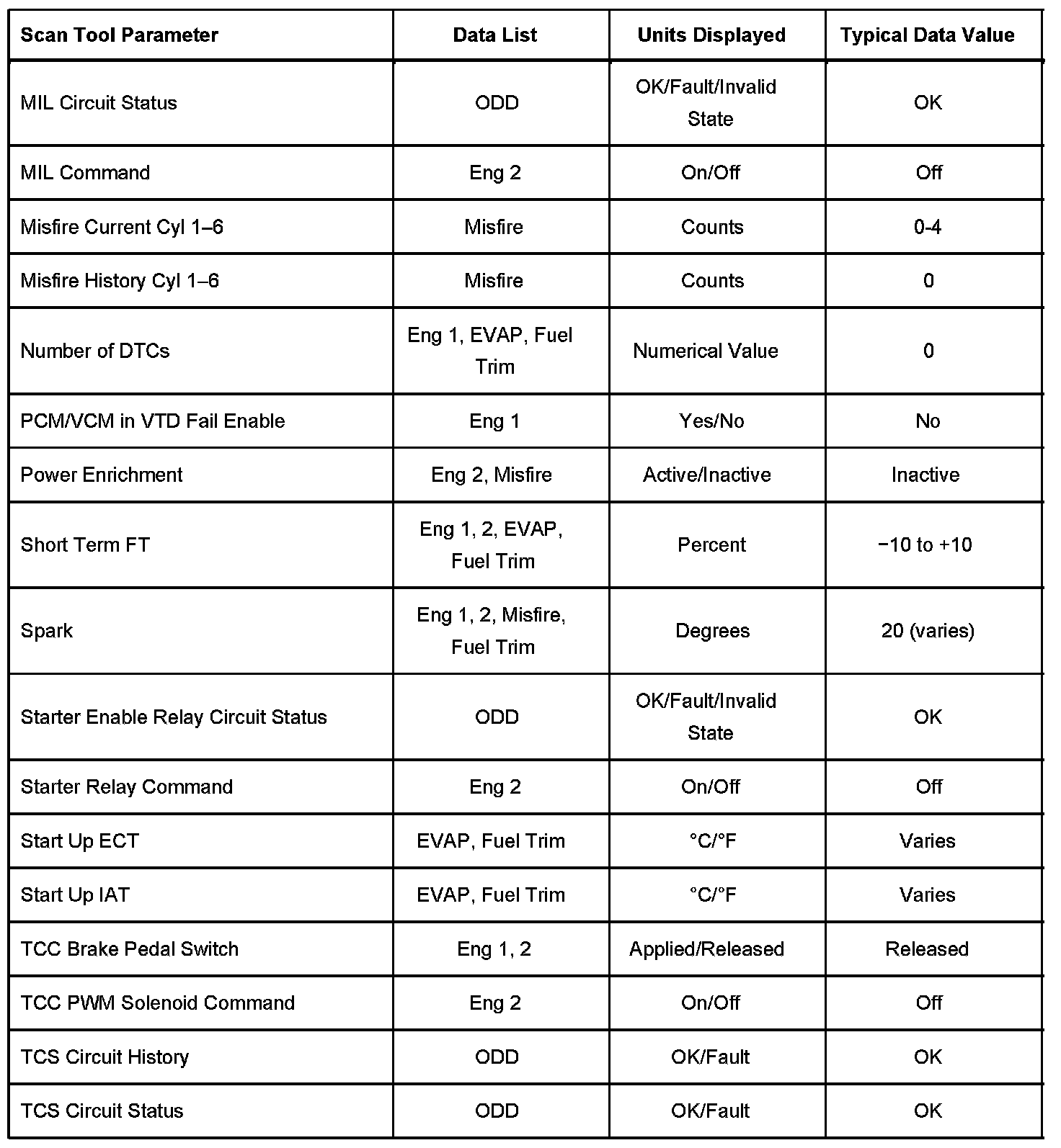 The column labeled Data List indicates where a parameter can be located on the scan tool. Refer to the scan tool operating manual for the exact locations of the data lists. The following is a description of each term listed:
