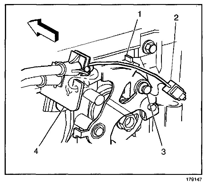 9. Install the cruise control cable (2) to the accelerator control bracket (4) and throttle body lever (3).