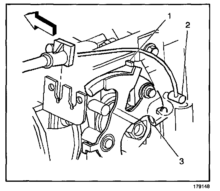 8. Install the accelerator control cable (2) to the accelerator control bracket and throttle body lever (3).