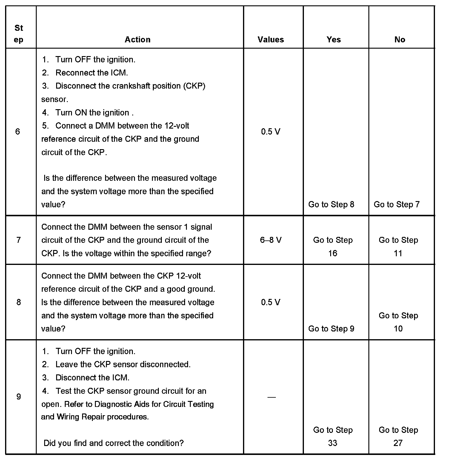 The ICM monitors the CKP sync signal when the engine is cranking. The CKP sync signal is passed from the CKP sensor to the ICM on the CKP sensor 2 signal circuit. The CKP sync signal is used to determine the correct cylinder pair and initiate the ignition coil firing sequence. The 18X reference pulses are passed from the CKP sensor to the ICM on the CKP sensor 1 circuit. The 18X reference pulses are used for fuel injection and ignition control. After the ICM receives both signals, the ICM passes the 18X and 3X reference signals to the PCM. The CMP and the CKP sensors share a 12 volt reference and low reference circuit. The CKP sensor consists of the following circuits: