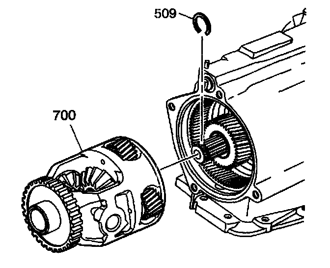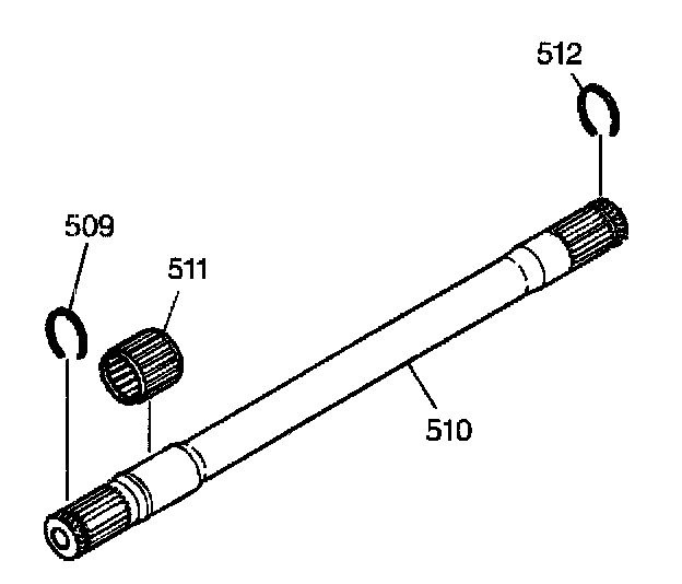 2. Install the drive axle retaining ring (509) and the output shaft differential inboard snap ring (512) onto the output shaft (510).