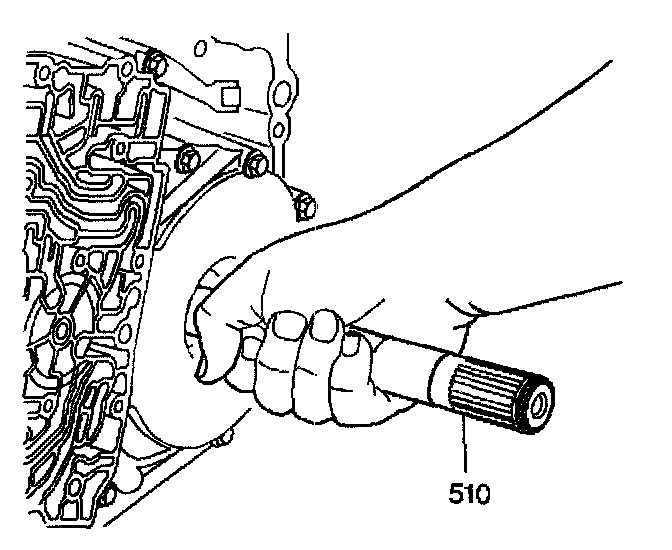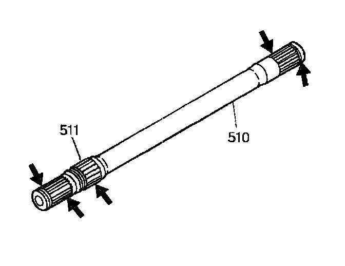 4. Hold the front differential carrier in place and carefully install the output shaft (510) into the transmission through the left wheel opening. Extend the output shaft through the differential side gear.
