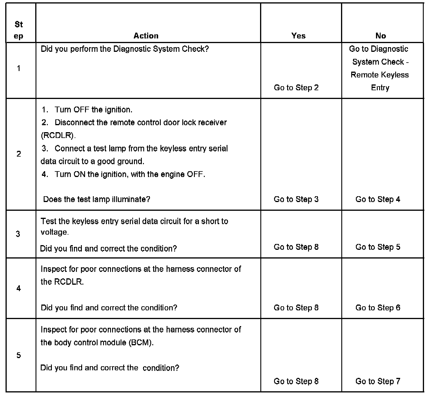The remote control door lock receiver (RCDLR) communicates with the body control module (BCM) through the keyless entry serial data circuit. When any button on the keyless entry transmitter is pressed, the transmitter sends a signal to the RCDLR. The RCDLR sends a lock, unlock, rear release, or panic alarm request to the BCM, depending on which button is pressed on the transmitter. The BCM receives the message and performs the appropriate function. The BCM also uses the keyless entry serial data circuit in order to communicate with the RCDLR when programming transmitters.
