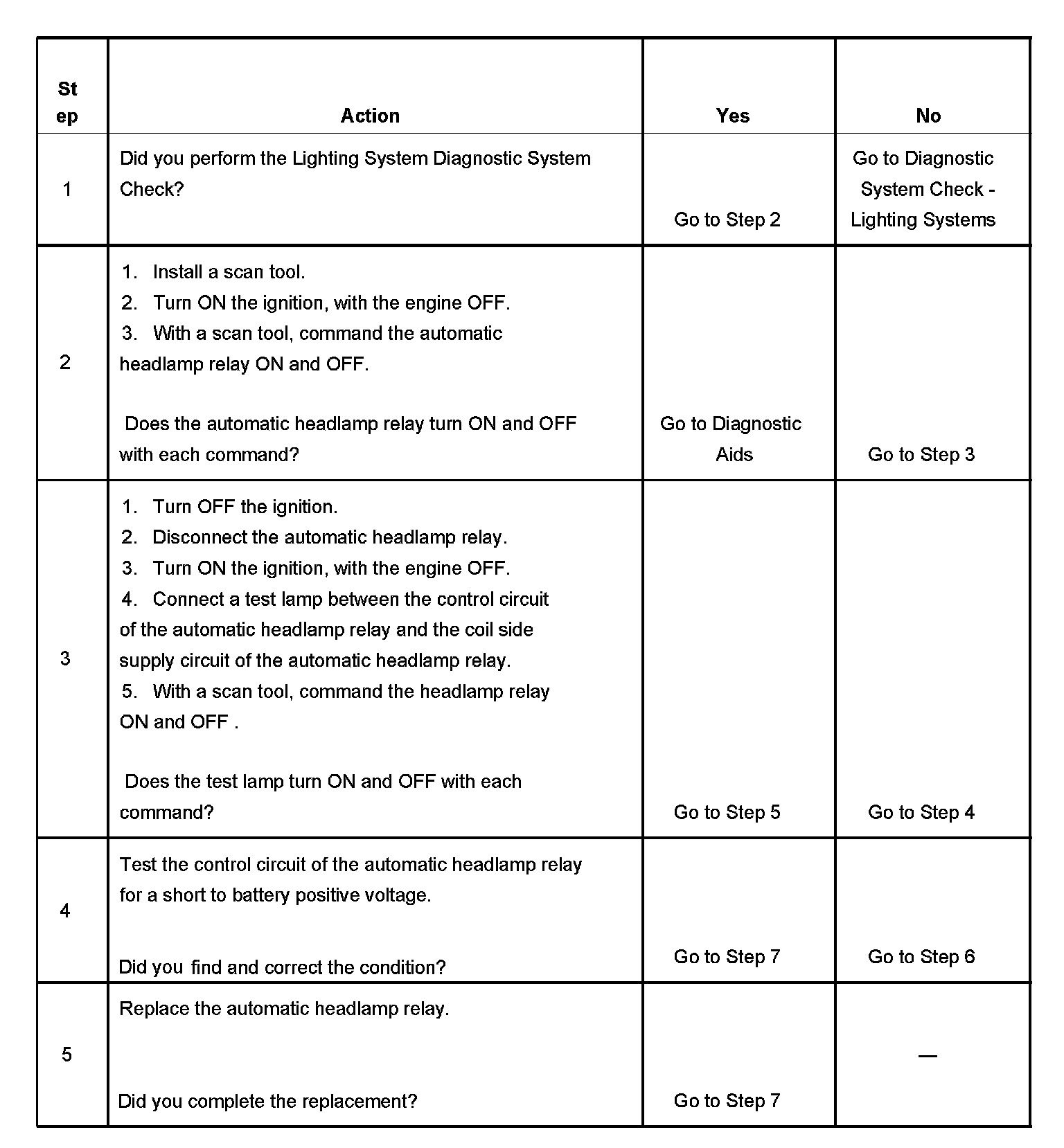 4. Test for a short to battery position voltage in the control circuit of the automatic headlamp relay.