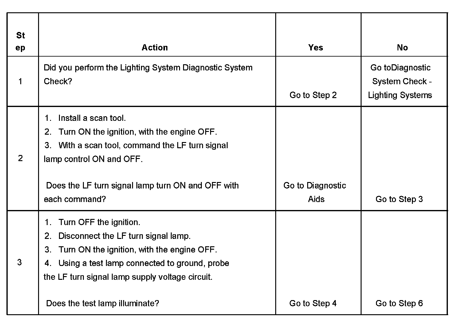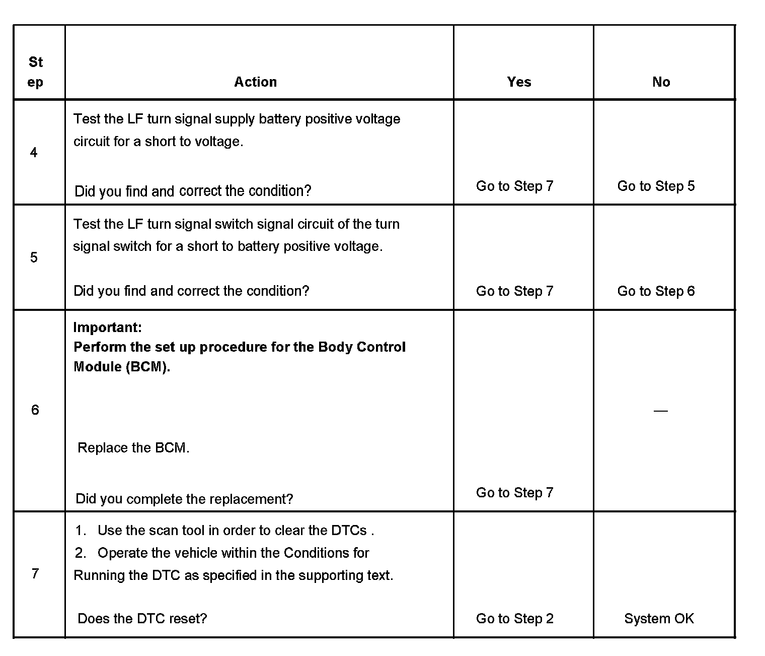 - The BCM detects a short to battery positive voltage in the LF turn signal lamp supply voltage circuit or the LF turn signal switch signal circuit.
