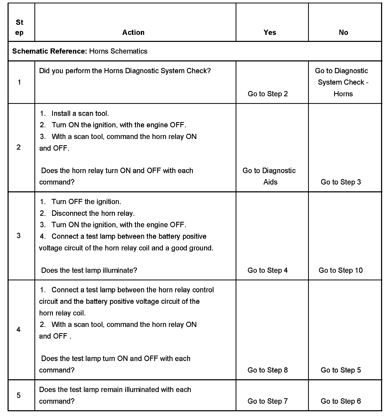 2. Listen for an audible click when the horn relay operates. Command both the ON and OFF states. Repeat the commands as necessary.