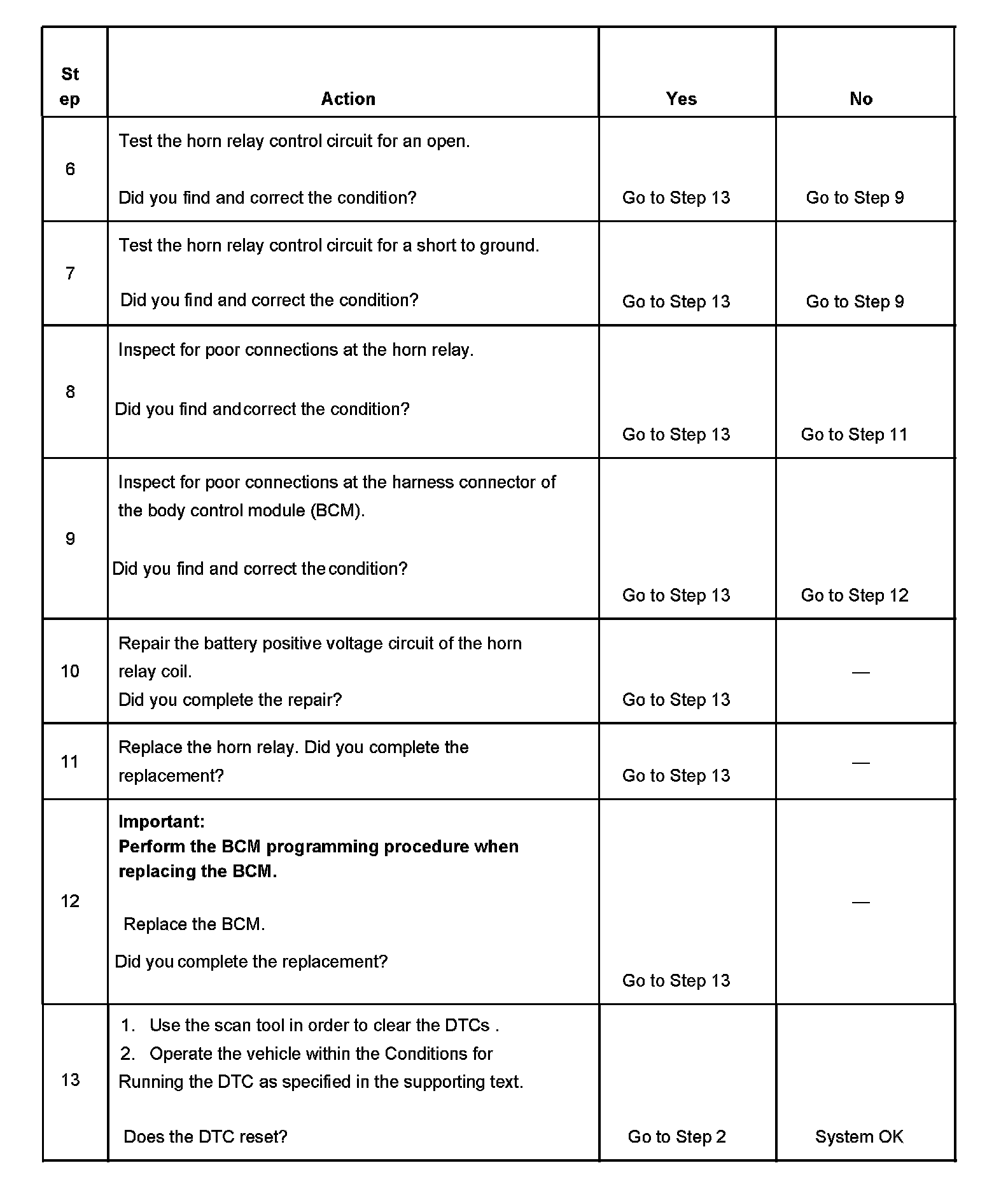 The BCM detects a short to ground or an open in the horn relay control circuit for approximately 300 milliseconds.