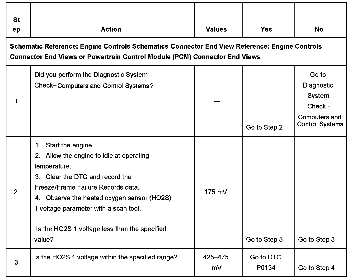 CIRCUIT DESCRIPTIONHeated oxygen sensors (HO2S) are used for fuel control and post catalyst monitoring. Each HO2S compares the oxygen content of the surrounding air with the oxygen content of the exhaust stream. When the vehicle is first started, the powertrain control module (PCM) operates in an Open Loop mode, ignoring the HO2S signal voltage when calculating the air-to-fuel ratio. The PCM supplies the HO2S with a reference, or bias, voltage of about 450 mV. The HO2S generates a voltage within a range of 0-1,000 mV that fluctuates above and below bias voltage once in Closed Loop. A high HO2S voltage output indicates a rich fuel mixture. A low HO2S voltage output indicates a lean mixture. Heating elements inside the HO2S minimize the time required for the sensors to reach operating temperature, and provide an accurate voltage signal. If the PCM detects that the HO2S 1 voltage remains below a calibrated amount for an excessive amount of time, DTC P0131 will set.