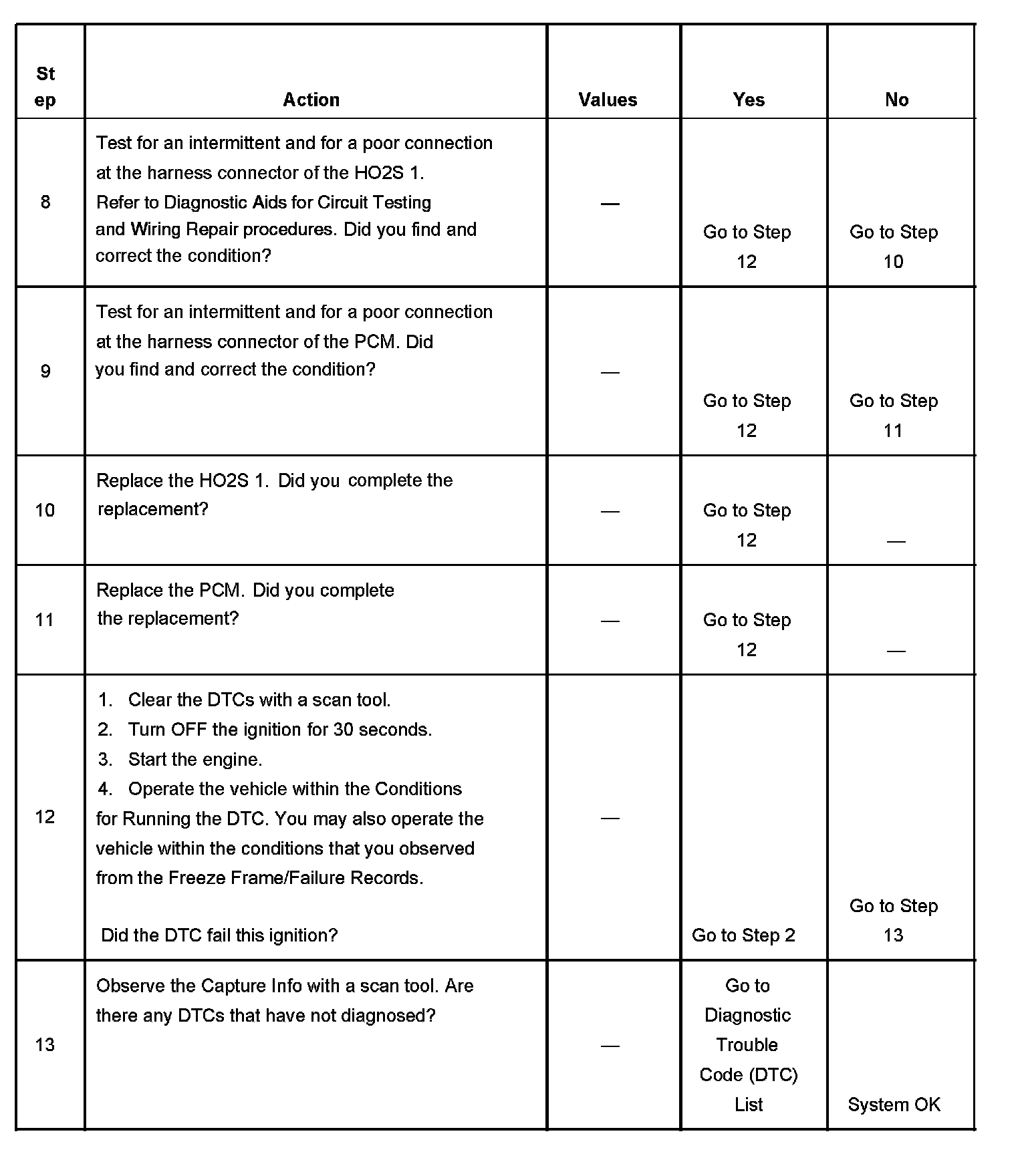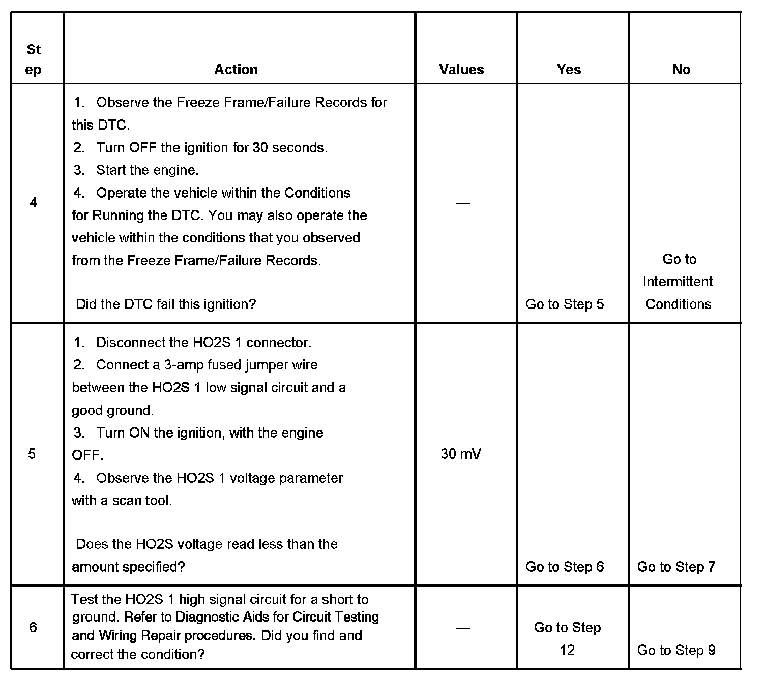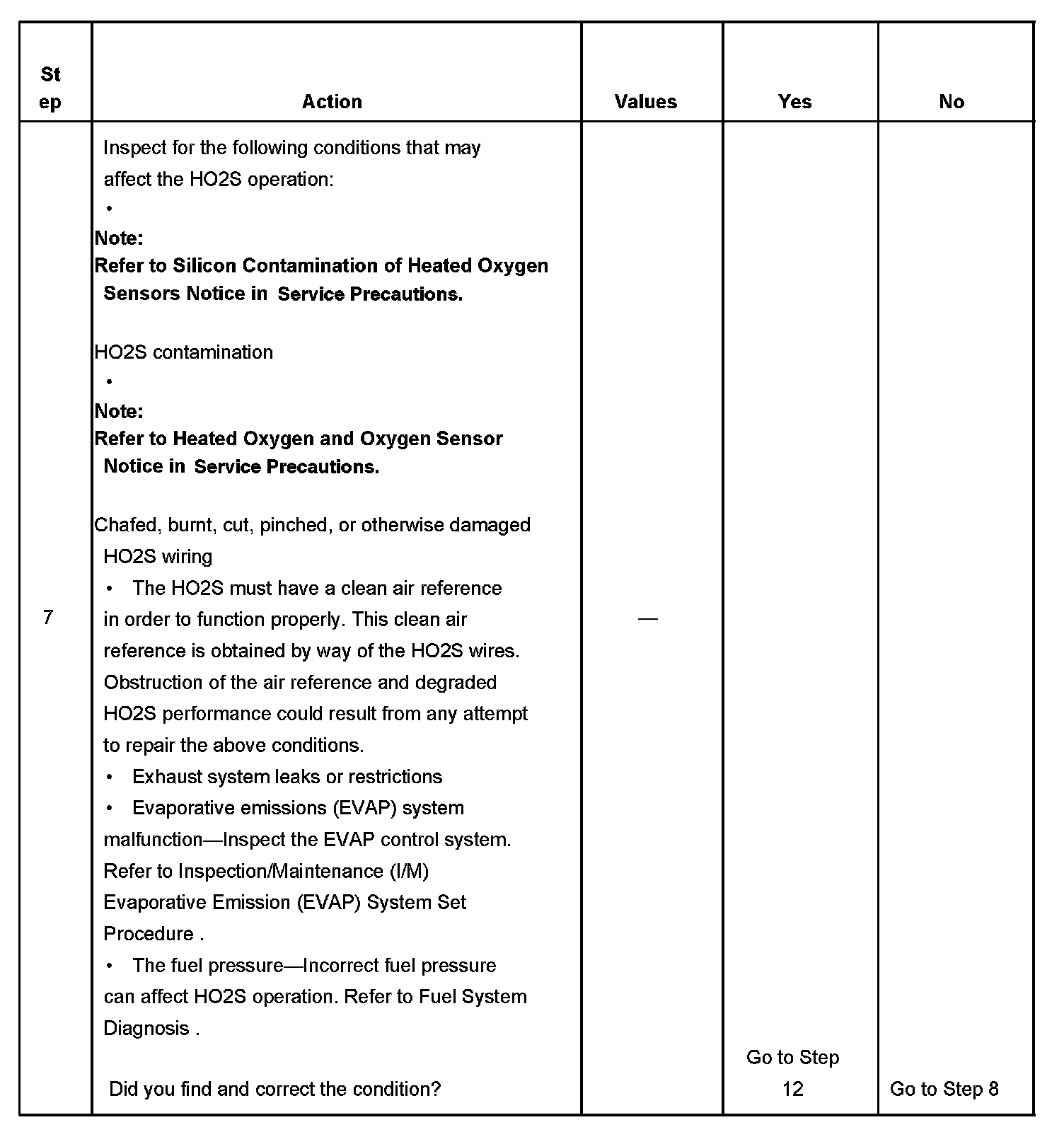 7. The conditions listed in the table may contribute to the failure of the HO2S. The conditions listed apply only to this type of failure.
