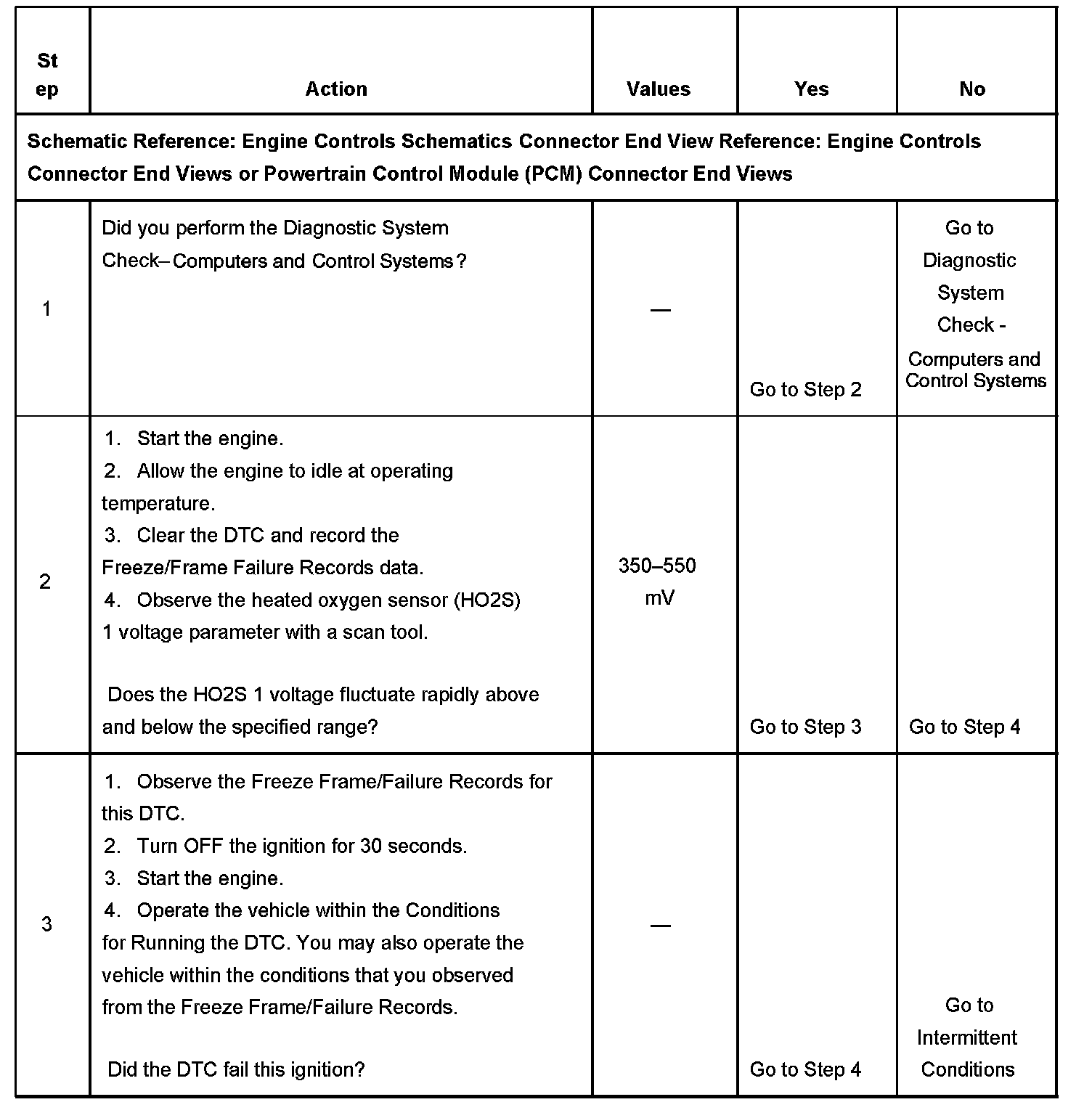 CIRCUIT DESCRIPTIONHeated oxygen sensors (HO2S) are used for fuel control and post catalyst monitoring. Each HO2S compares the oxygen content of the surrounding air with the oxygen content of the exhaust stream. When the vehicle is first started, the powertrain control module (PCM) operates in an Open Loop mode, ignoring the HO2S signal voltage when calculating the air-to-fuel ratio. The PCM supplies the HO2S with a reference, or bias, voltage of about 450 mV. The HO2S generates a voltage within a range of 0-1,000 mV that fluctuates above and below bias voltage once in Closed Loop. A high HO2S voltage output indicates a rich fuel mixture. A low HO2S voltage output indicates a lean mixture. Heating elements inside the HO2S minimize the time required for the sensors to reach operating temperature, and provide an accurate voltage signal. If the PCM detects that the HO2S 1 voltage average response time is too slow, DTC P0133 will set.