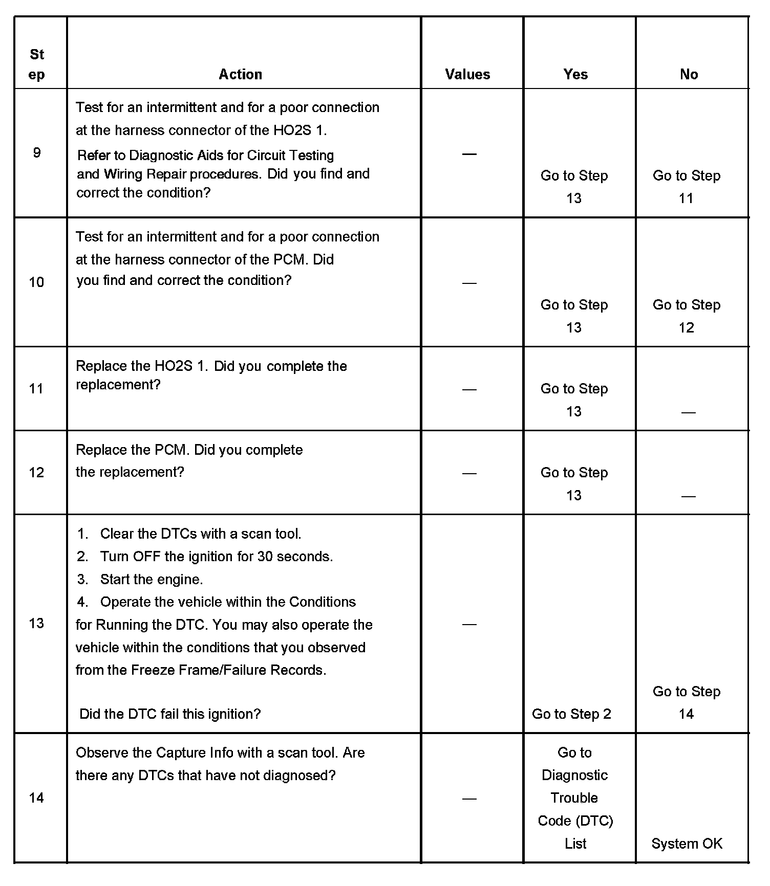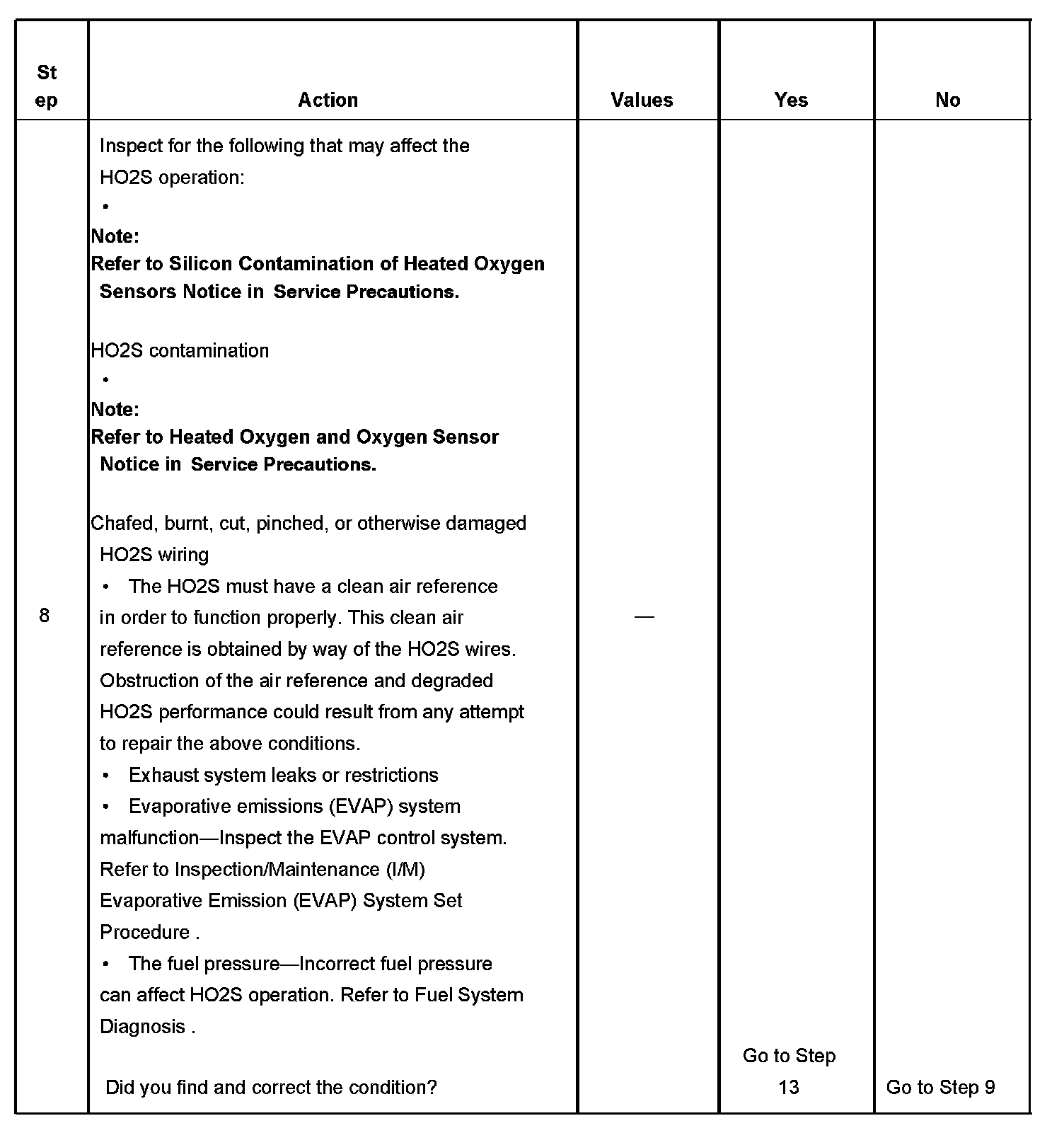 8. The conditions listed in the table may contribute to the failure of the HO2S. The conditions listed apply only to this type of failure.