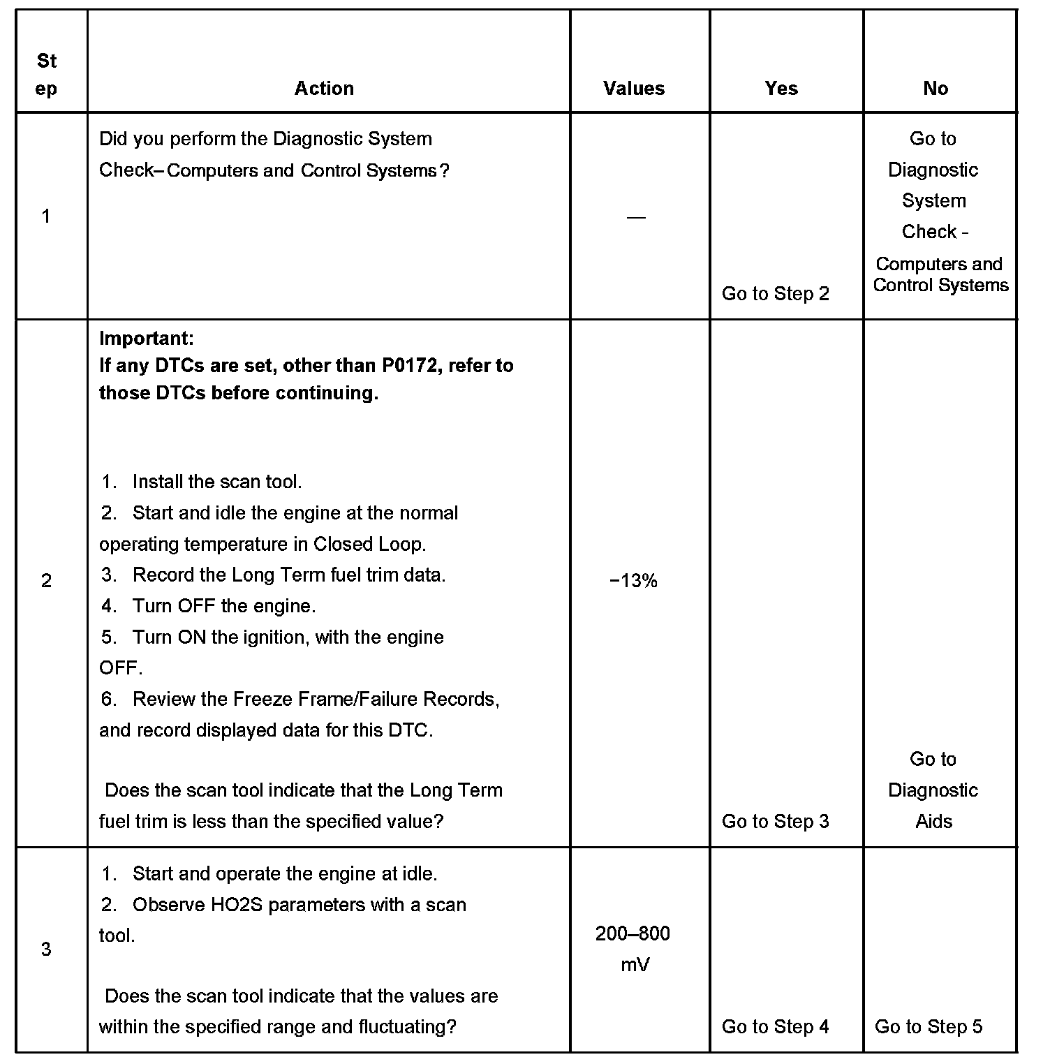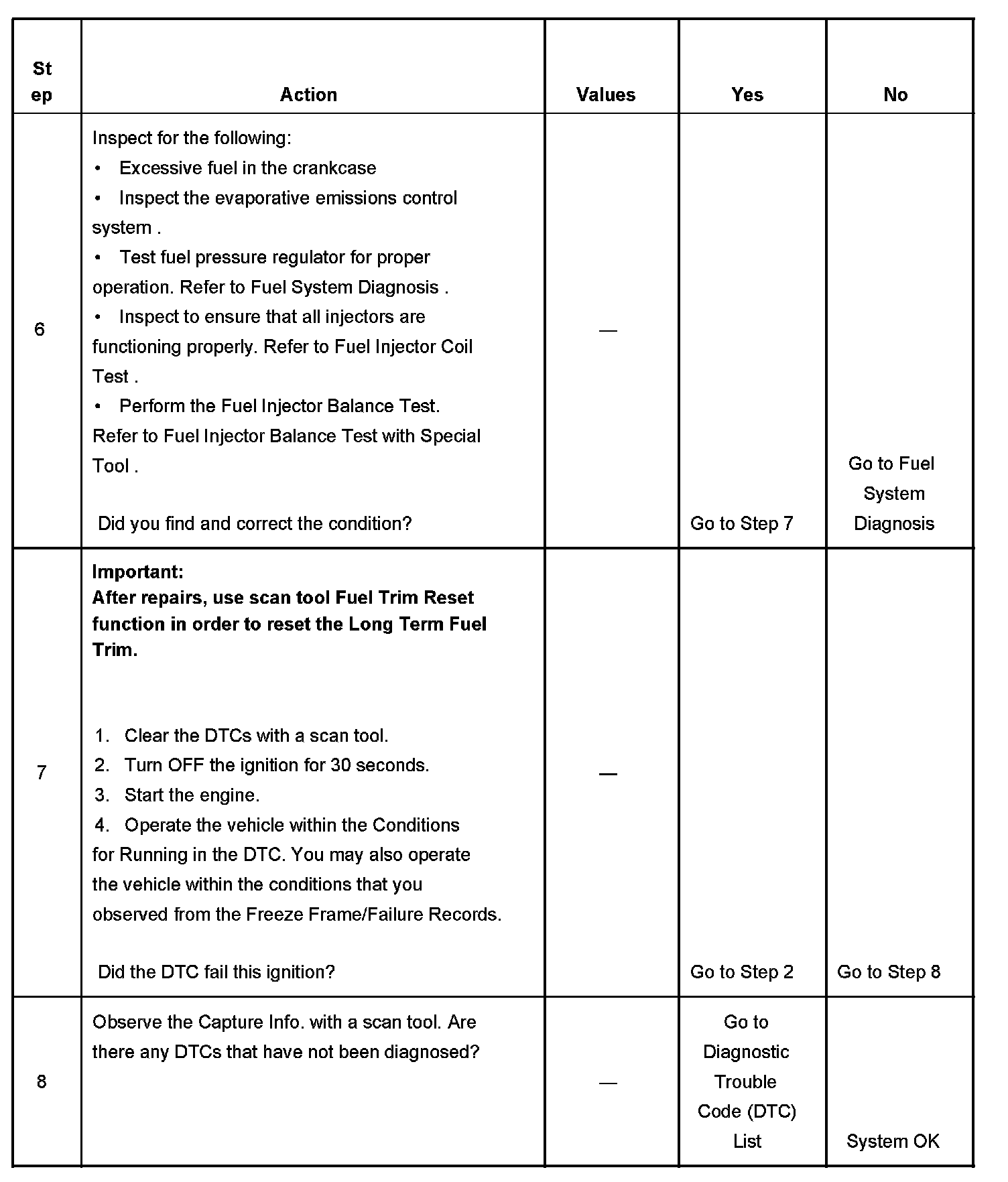 CIRCUIT DESCRIPTIONThe powertrain control module (PCM) controls the air/fuel metering system in order to provide the best possible combination of driveability, fuel economy and emission control. Fuel delivery is controlled differently during Open and Closed Loop. During Open Loop the PCM determines fuel delivery based on sensor signals, without oxygen sensor input. During Closed Loop, the oxygen sensor inputs are added and used by the PCM to calculate Short and Long Term fuel trim fuel delivery adjustments. If the oxygen sensors indicate a lean condition, fuel trim values will be above 0 percent. If the oxygen sensors indicate a rich condition, fuel trim values will be below 0 percent. Short Term fuel trim values change rapidly in response to the HO2S voltage signals. Long Term fuel trim makes coarse adjustments in order to maintain an air/fuel ratio of 14.7:1. The fuel trim diagnostic will conduct a test to determine if a rich failure actually exists or if excessive vapor from the evaporative emission (EVAP) canister is causing a rich condition. If the PCM detects an excessively rich condition, this diagnostic trouble code (DTC) will set. If the PCM detects excessive vapor then a pass is logged.