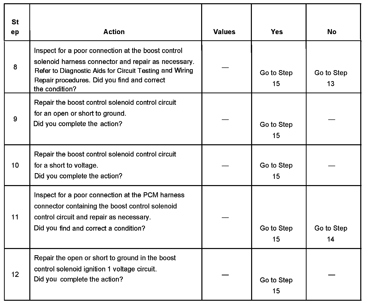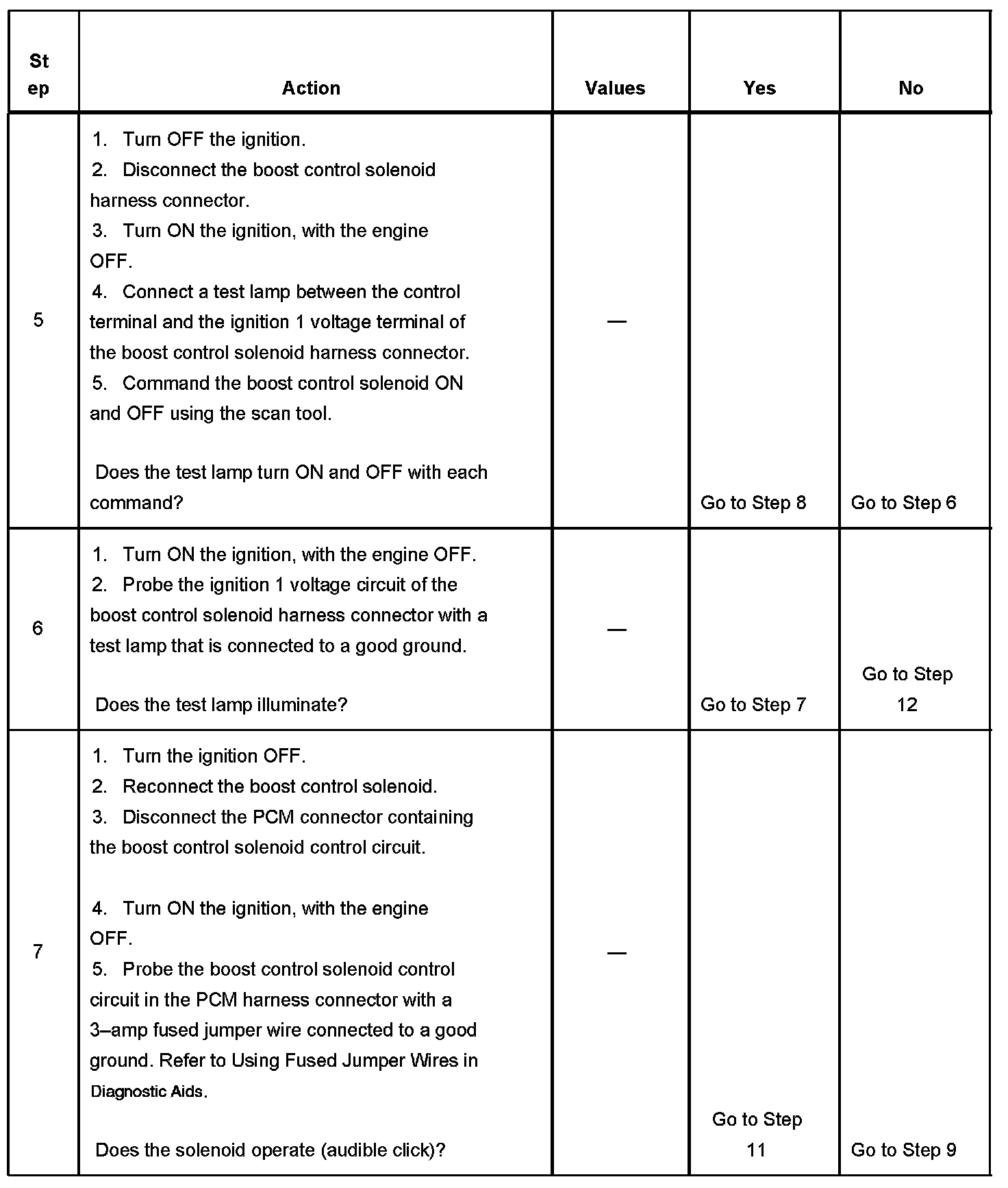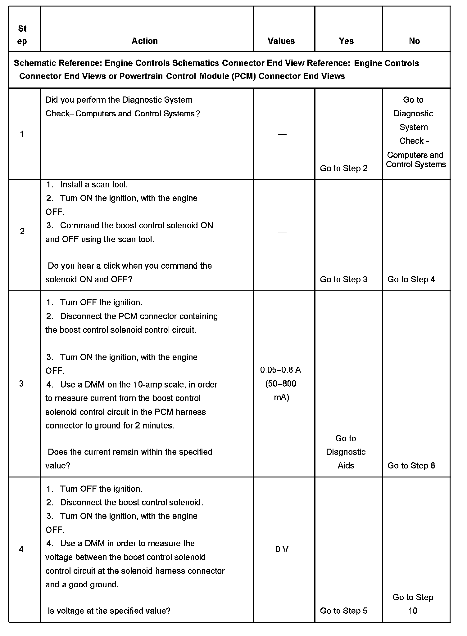 If the harness appears to be OK, disconnect the PCM, turn ON the ignition and observe a voltmeter connected between the boost control solenoid control circuit and ground at the PCM harness connector while moving connectors and wiring harnesses related to the boost control solenoid. A change in voltage will indicate the location of the malfunction.