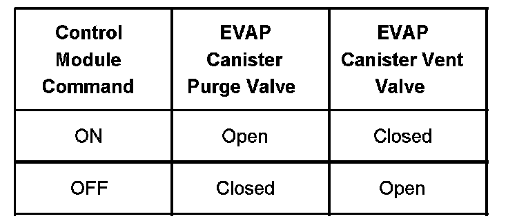 The table illustrates the relationship between the ON and OFF states, and the Open or Closed states of the EVAP canister purge and vent valves.