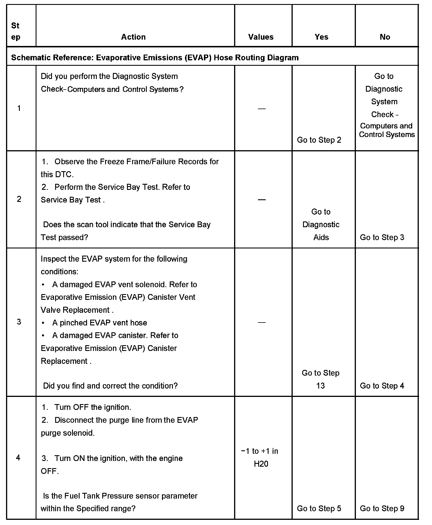 SYSTEM DESCRIPTIONThis DTC tests the evaporative emission (EVAP) system for a restricted or blocked EVAP vent path. The control module commands the EVAP canister purge solenoid Open and the EVAP canister vent solenoid Closed. This allows vacuum to be applied to the EVAP system. Once a calibrated vacuum level has been reached, the control module commands the EVAP canister purge solenoid Closed and the EVAP canister vent solenoid Open. The control module monitors the fuel tank pressure (FTP) sensor for a decrease in vacuum. If the vacuum does not decrease to near 0 inches H2O in a calibrated time, this DTC sets.