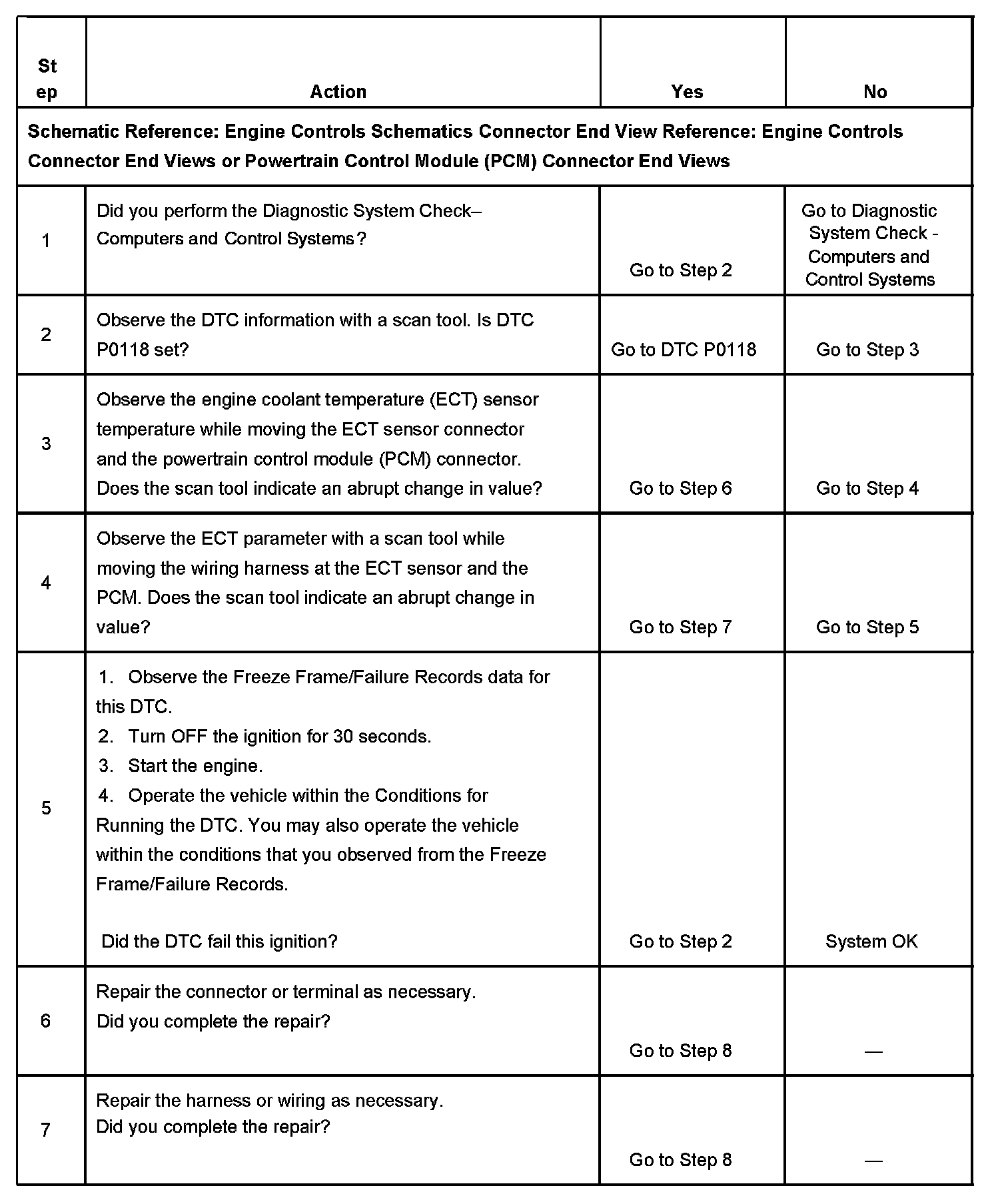 CIRCUIT DESCRIPTIONThe engine coolant temperature (ECT) sensor is a variable resistor, that measures the temperature of the engine coolant. The powertrain control module (PCM) supplies 5 volts to the ECT signal circuit and a ground for the ECT low reference circuit. When the ECT is cold, the sensor resistance is high. When the ECT increases, the sensor resistance lowers. With high sensor resistance, the PCM detects a high voltage on the ECT signal circuit. With lower sensor resistance, the PCM detects a lower voltage on the ECT signal circuit. If the PCM detects an excessively high signal voltage, which is a low temperature indication, DTC P1115 sets.