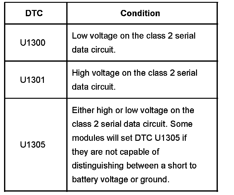 Modules connected to the class 2 serial data circuit monitor for serial data communications during normal vehicle operation. Operating information and commands are exchanged among the modules. In addition to this, Node Alive messages are transmitted by each module on the class 2 serial data circuit about once every 2 seconds. When the module detects one of the following conditions on the class 2 serial data circuit for approximately 3 seconds, the setting of all other class 2 serial communication DTCs is inhibited and a DTC will set.