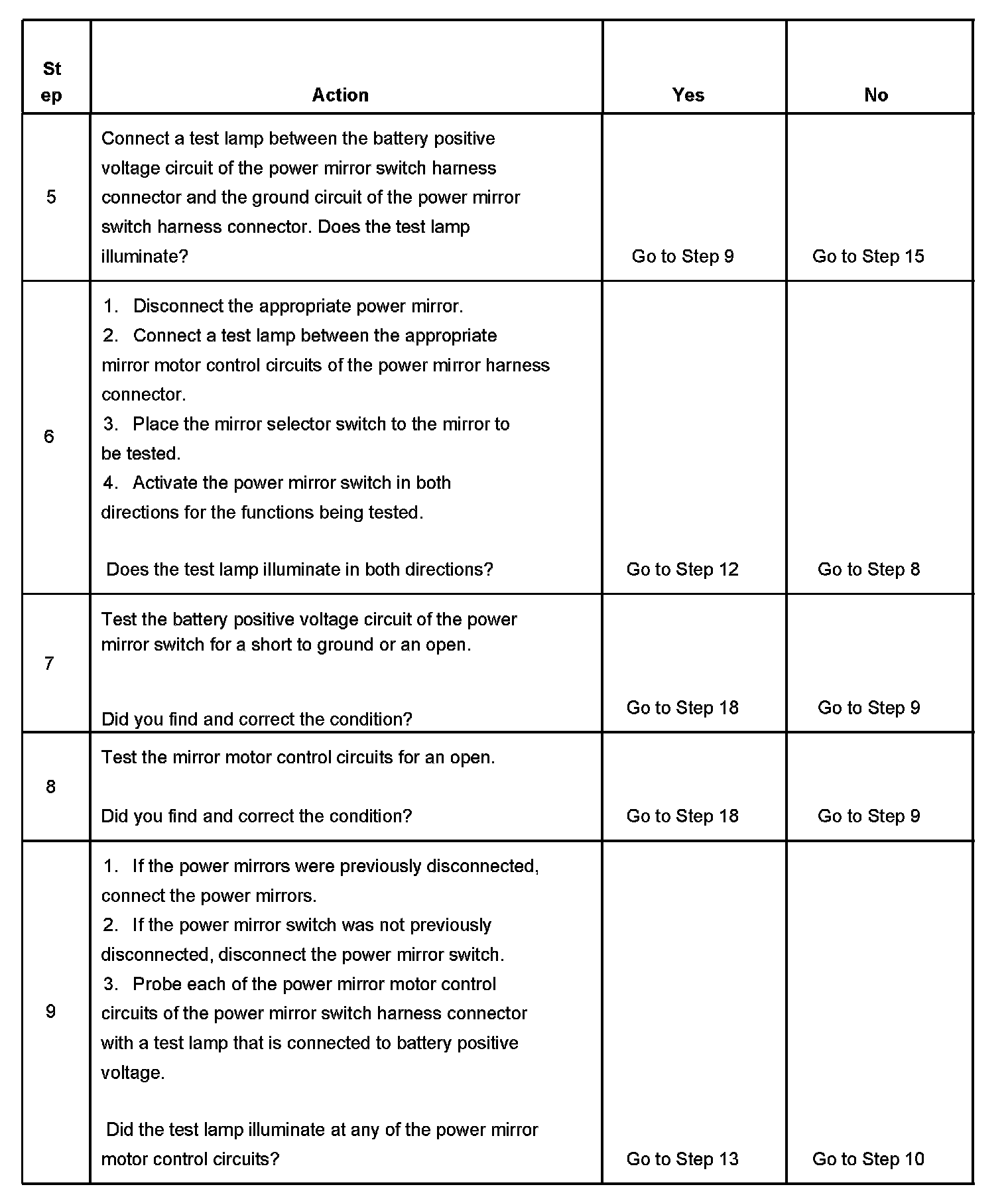 6. This step tests the integrity of both the mirror control circuits and the power mirror switch. If both power mirrors are inoperative on one or more axis, begin testing by disconnecting one of the power mirrors, if an open circuit is detected and repaired for that power mirror, repeat step 6 for the other power mirror.