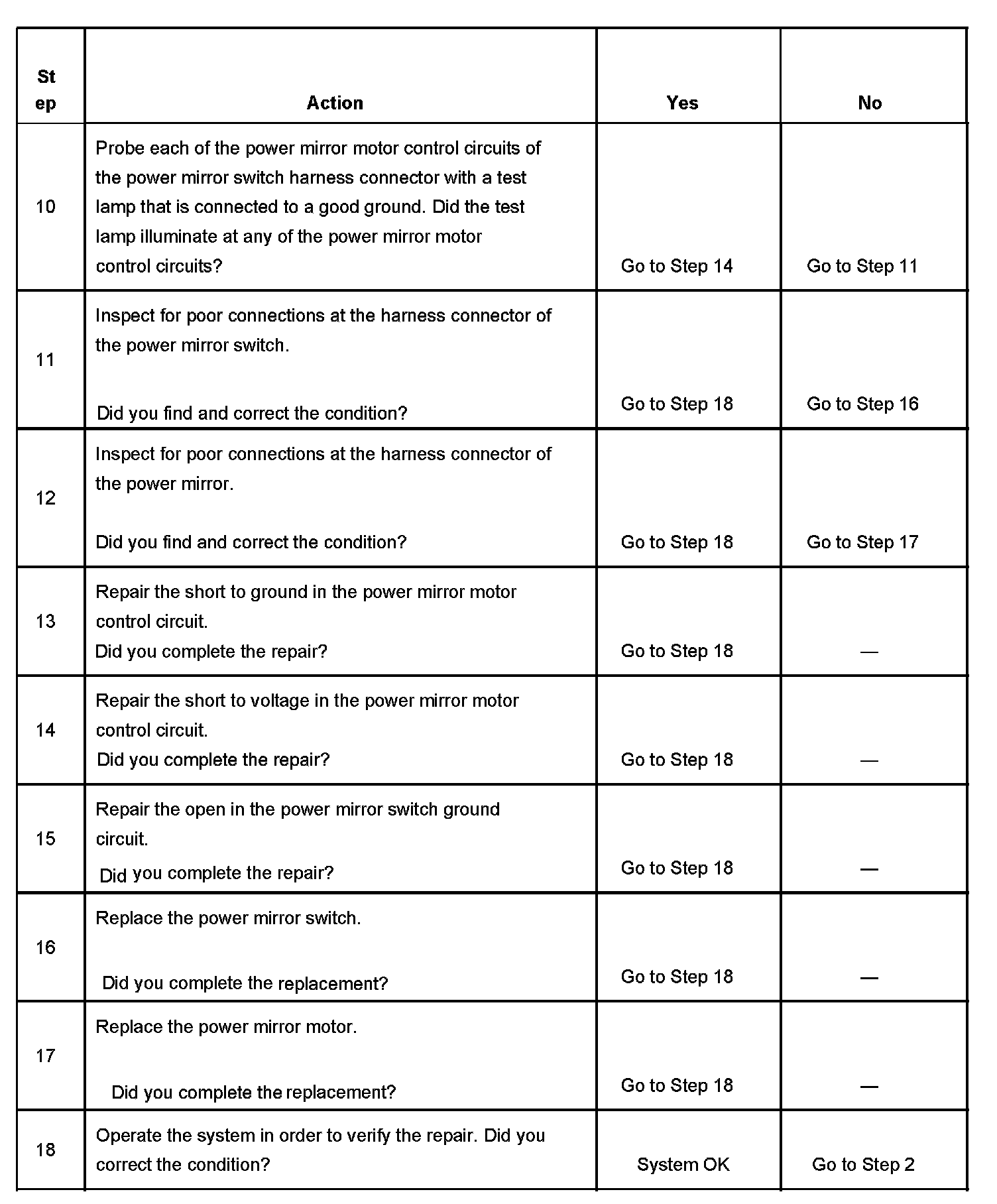 - If the power mirror system fuse is open and a short to ground in the battery positive voltage circuit is not detected, the fault could be a short to ground in one of the power mirror control circuits. This would open the power mirror system fuse when the mirror switch is pressed.
