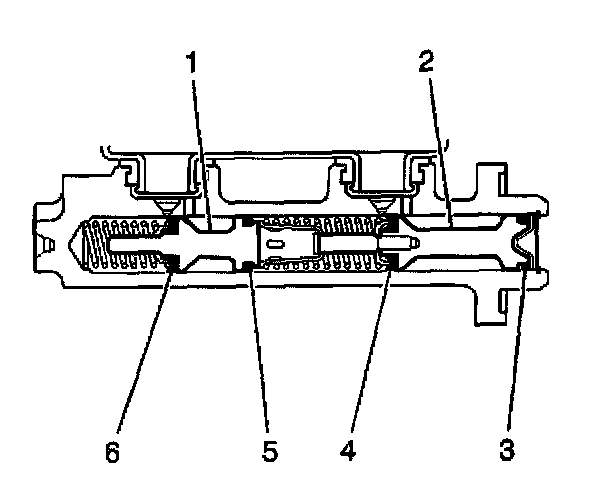9. Plug the cylinder inlet ports and the rear outlet port. Apply low pressure, non-lubricated, filtered air into the front outlet port, in order the remove the secondary piston (1) with the primary (6) and secondary (5) seals, and the return spring.