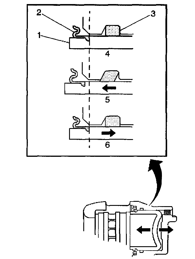 3. While the brake system is at rest (4), observe the position of the caliper piston (1) in relation to the caliper housing.