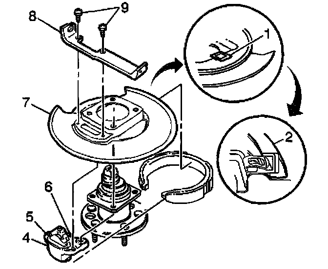 3. Position the park brake shoe, actuator (4), and backing plate (7) over the rear hub.