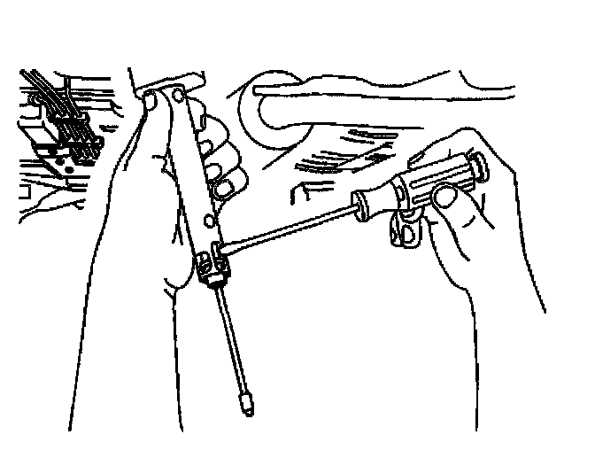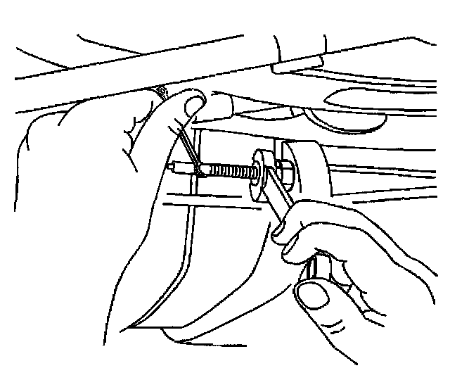 4. Remove the equalizer assembly from the front park brake cable. Insert a flat bladed tool into the equalizer and lightly twist to reposition the equalizer retaining tab. This will release the assembly from the cable.