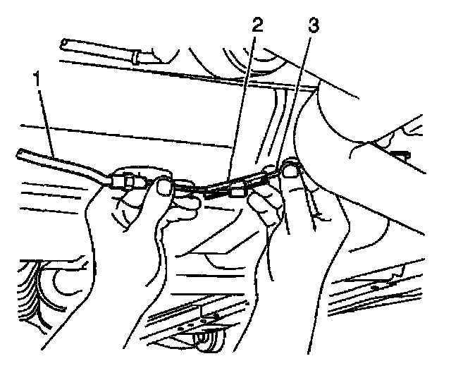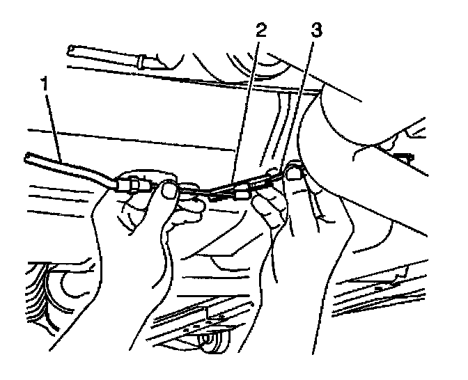 3. Disconnect the front park brake cable (1) from the right rear cable (3) at the connector clip (2).