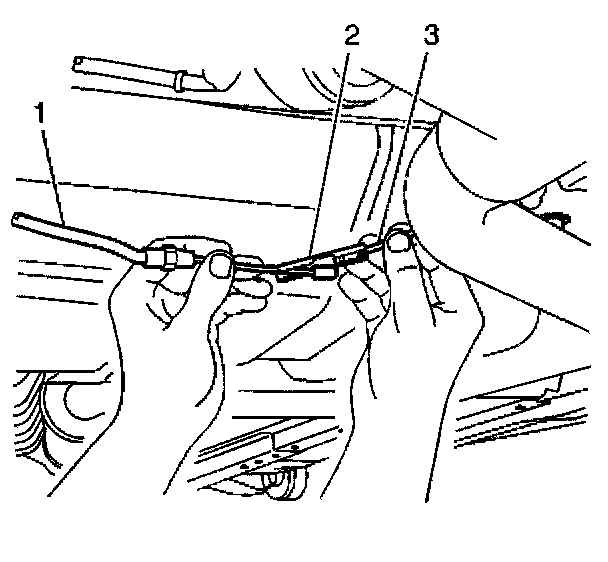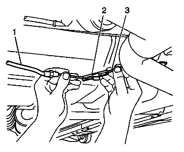 ^ For the right rear cable, disconnect the cable (3) from the clip (2).