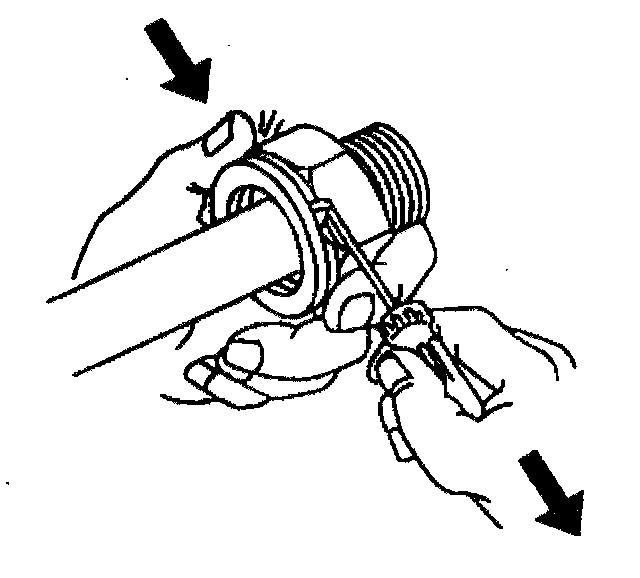 11. Using a bent-tip screwdriver' pull on one of the open ends of the retaining ring in order to rotate the retaining ring around the quick connect fitting until the retaining ring is out of position and can be completely removed.