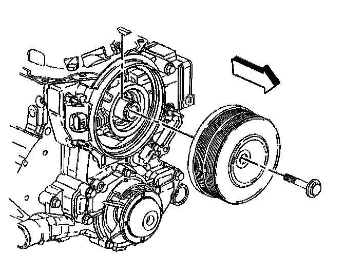 ^ Tighten the crankshaft balancer bolt to 150 Nm (111 ft. lbs.). Use J 36660-A to tighten the crankshaft balancer bolt an additional 76°.