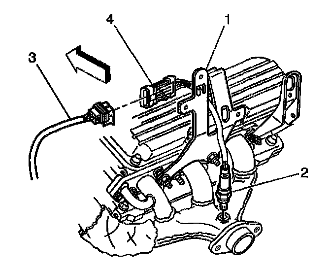 13. Install the Heated Oxygen (HO2S) Sensor electrical connector (4) to the engine sight shield bracket (1).