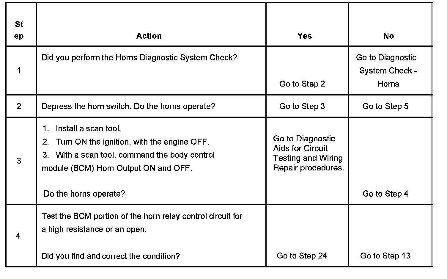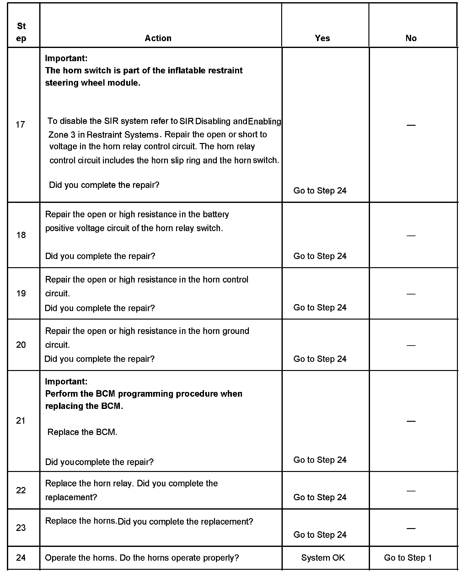 17. The horn relay control circuit includes the horn slip ring and the horn switch. The horn switch is part of the inflatable restraint steering wheel module. The horn slip ring and the horn switch must be tested for a high resistance, an open or a short to voltage when testing the relay control circuit.