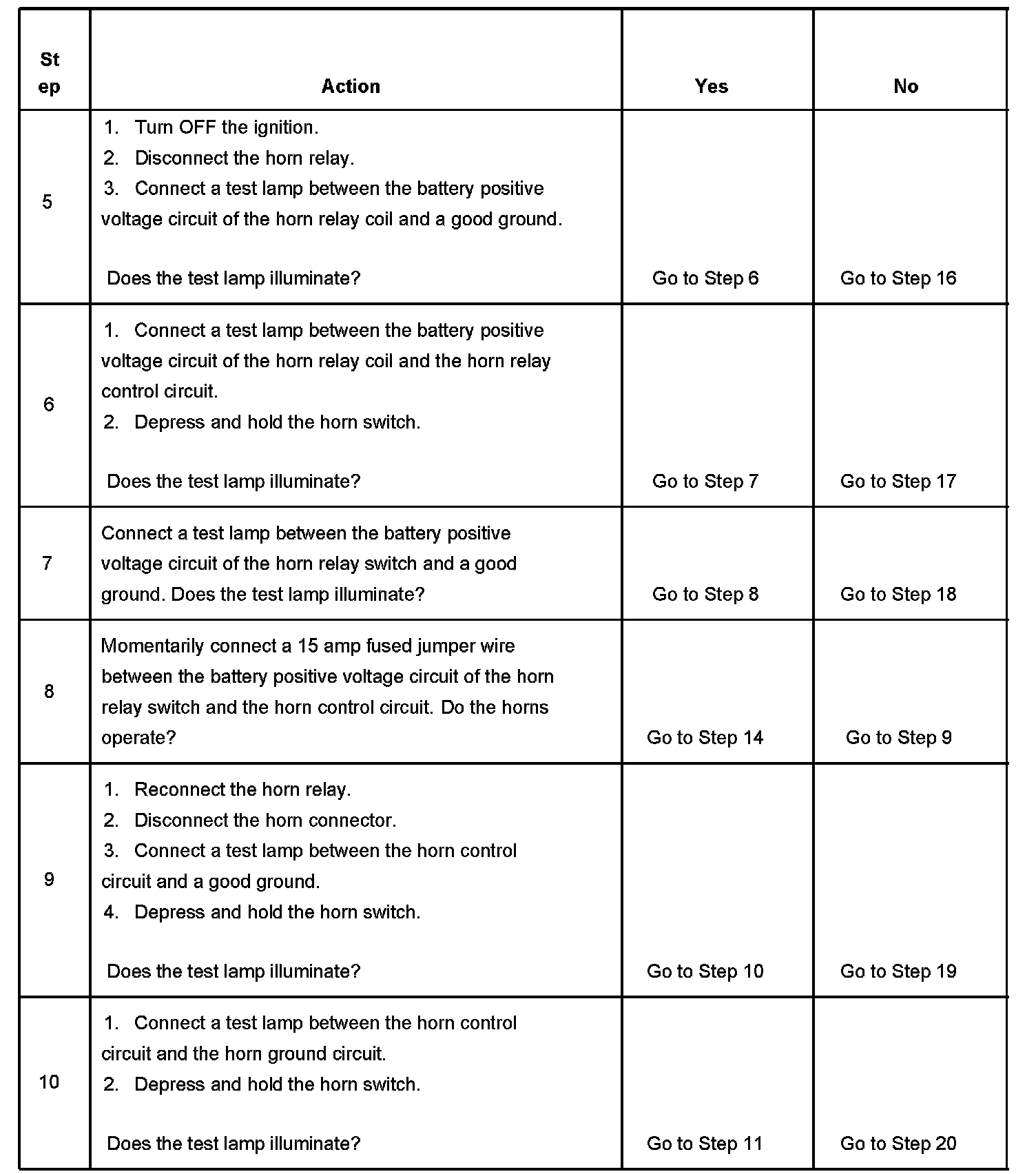 5. Tests for voltage at the battery positive voltage terminal of the horn relay coil.