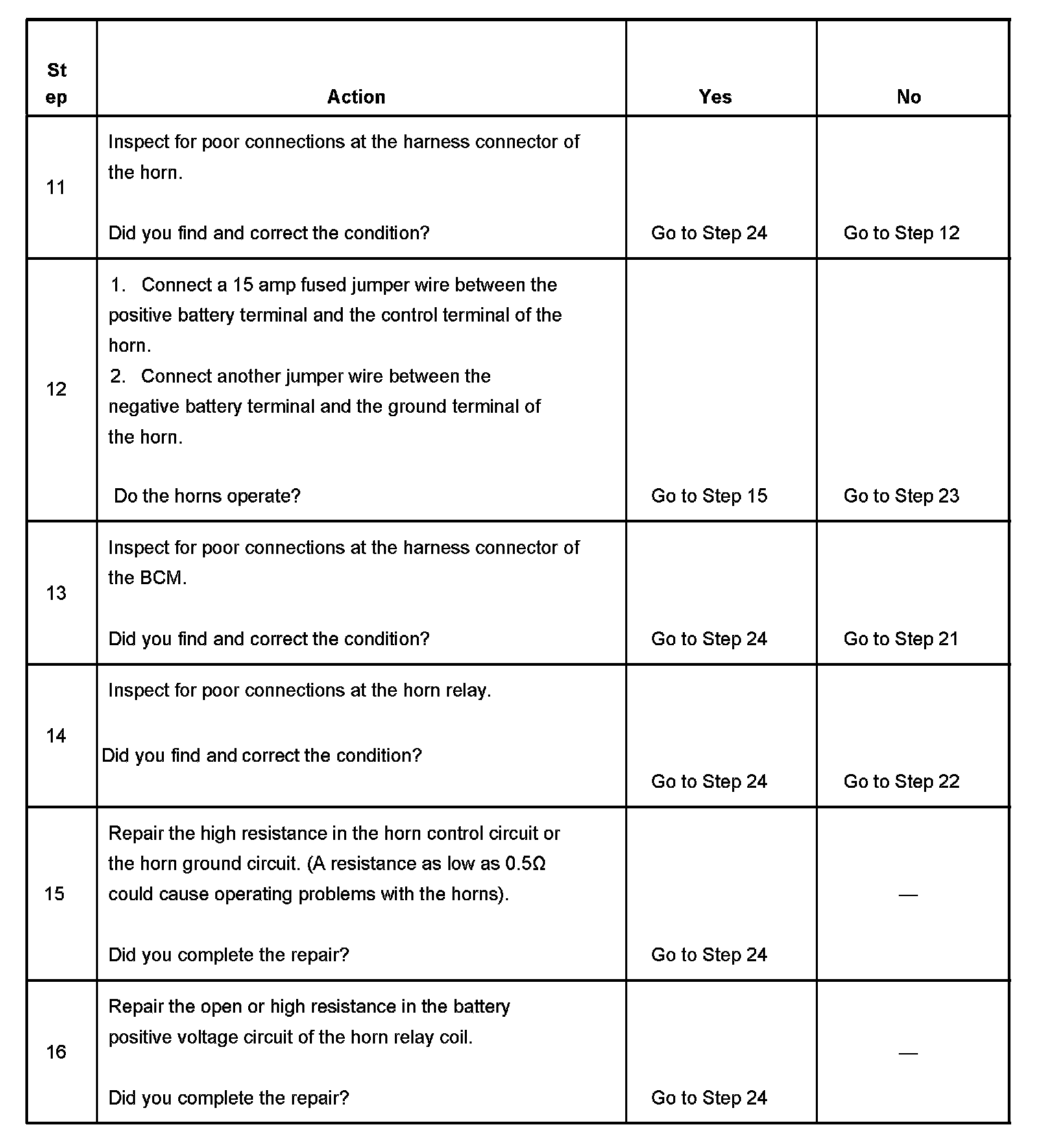 15. The horns need maximum current flow to operate properly. A high resistance (greater than 0.5 ohms) in the horn control circuit or the horn ground circuit could cause operating problems with the horns. Check the circuits for faults that would restrict current flow.