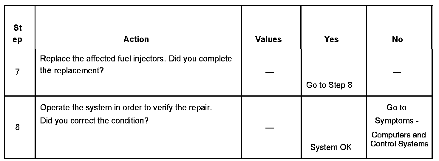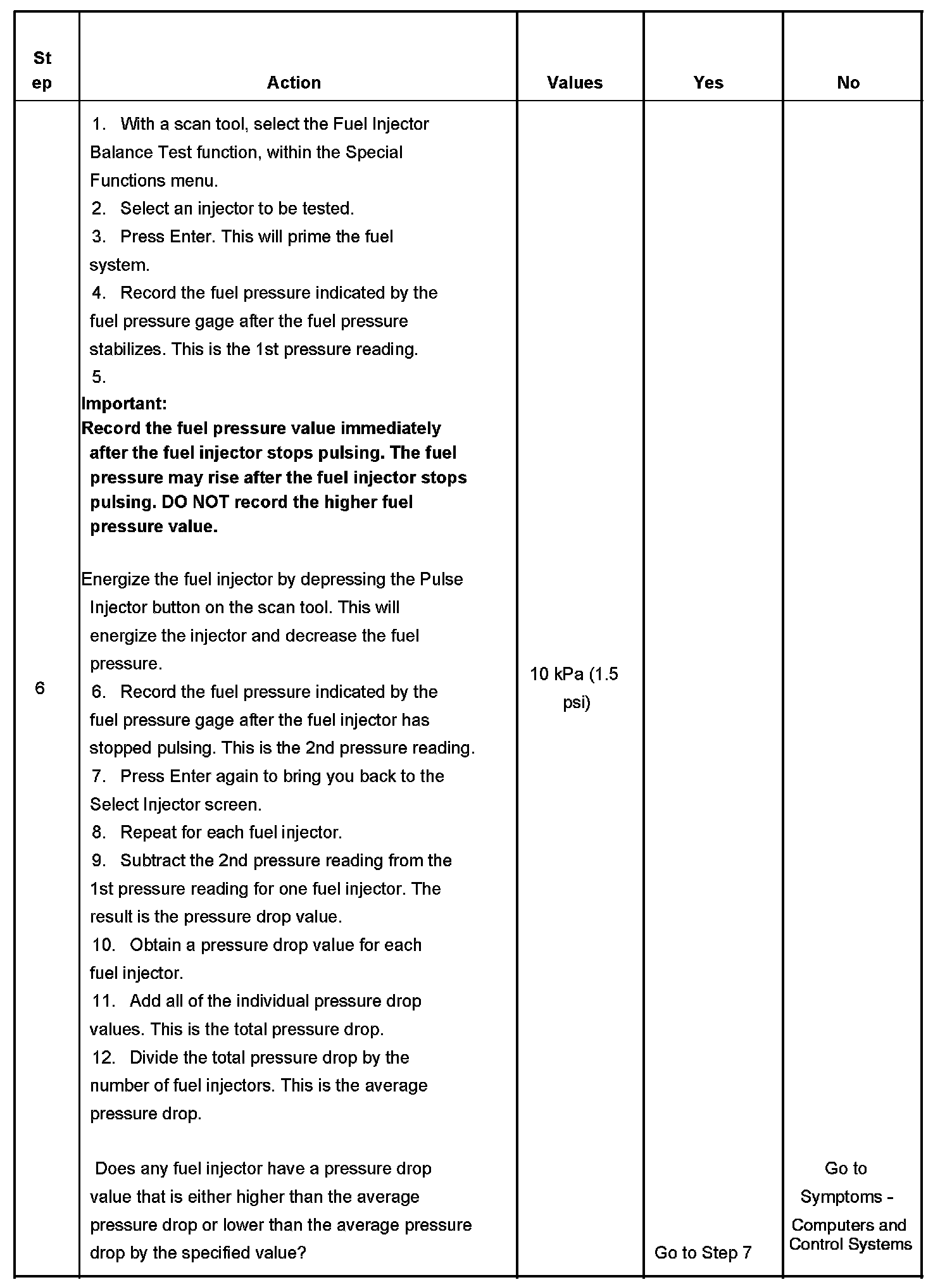 6. If the pressure drop value for each fuel injector is within 10 kPa (1.5 psi) of the average pressure drop value, the fuel injectors are flowing properly. Calculate the pressure drop value for each fuel injector by subtracting the second pressure reading from the first pressure reading.