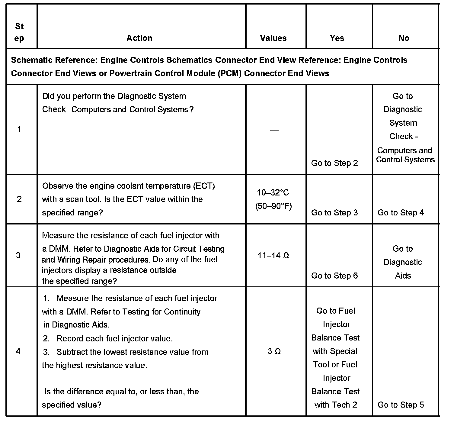 - If the fuel injector coil test does not isolate the condition perform the fuel injector balance test. Refer to Fuel Injector Balance Test with Special Tool or Fuel Injector Balance Test with Tech 2. Component Tests and General Diagnostics