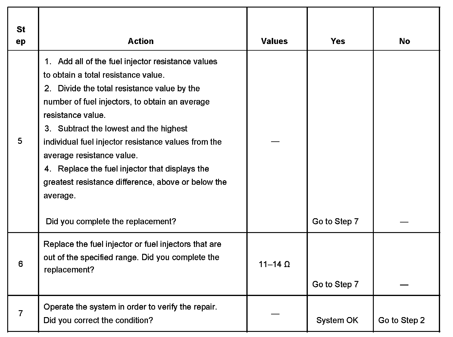 4. This step determines if all of the fuel injectors are within 3 ohms of each other. If the highest resistance value is within 3 ohms of the lowest resistance value, then all of the fuel injector coil windings are OK.