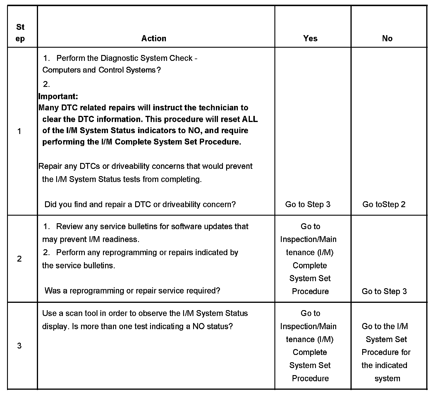 1. Any DTCs set, even those that are not listed in the Inspection/Maintenance System DTC Table, may prevent the required DTCs from running. If there is any question as to whether a set DTC is disabling the required I/M diagnostic, review the conditions for running in the diagnostic procedures for the DTC required by the I/M diagnostic. A list of disabling DTCs, if applicable, is contained in the supporting text for that DTC.