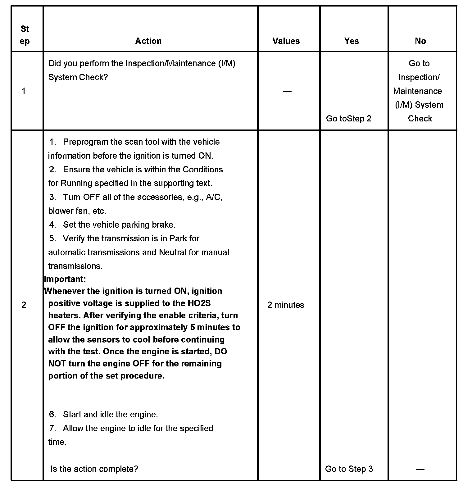 The purpose of the I/M Complete System Set Procedure is to satisfy the enable criteria necessary to execute all of the I/M readiness diagnostics, and complete the trips for those particular diagnostics. When all diagnostic tests are completed, the I/M System Status indicators are set to YES. Perform this test when more than one or all of the I/M System Status indicators are set to NO.