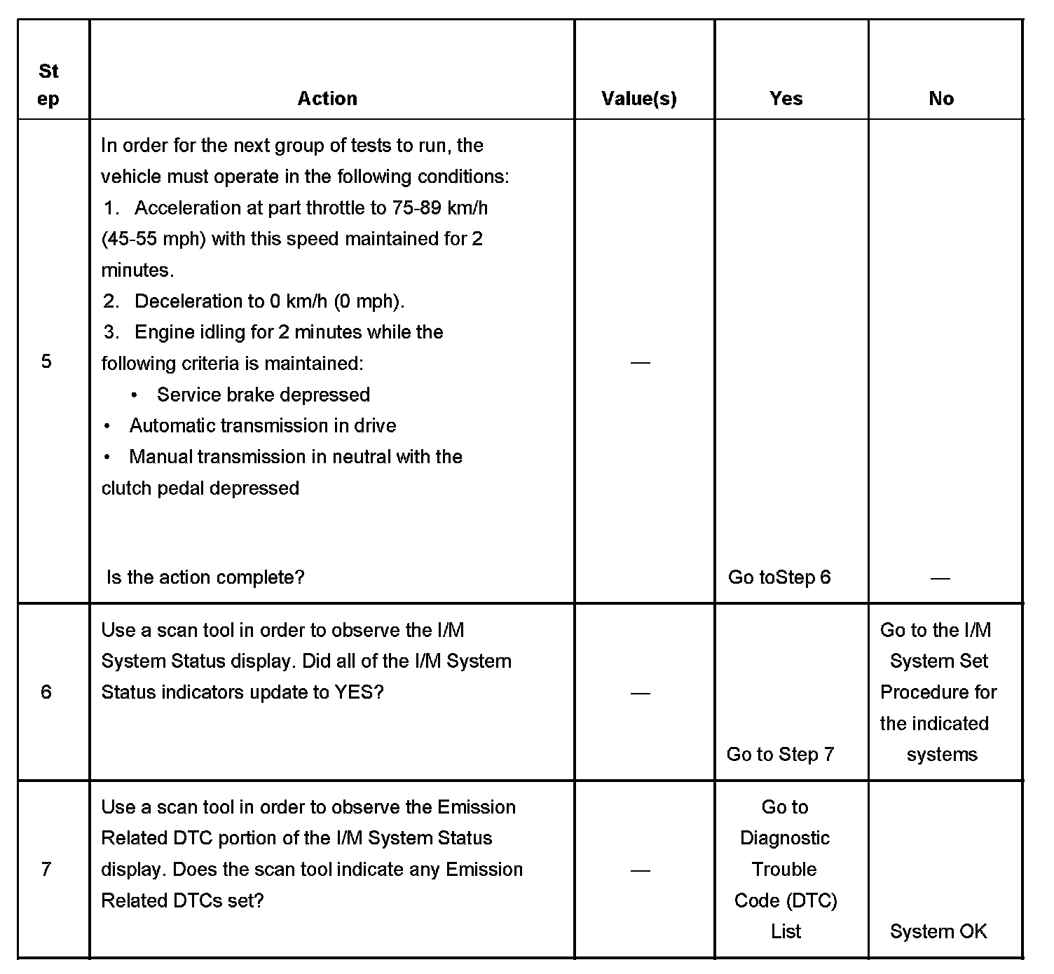 The scan tool can be used to monitor each of the I/M System Status indicators during the I/M Complete System Set Procedure. When all of the indicators for a test step have updated to YES, testing can move on to the next step even if the remaining portion of the test is not complete. For example, step 3 is designed to run the EVAP, AIR, and HO2S tests. The procedure instructs the technician to operate the vehicle in the enable conditions for 6 minutes. If all 3 tests have updated to YES within 4 minutes, you do not need to continue with the enable conditions and testing can advance to the next step.