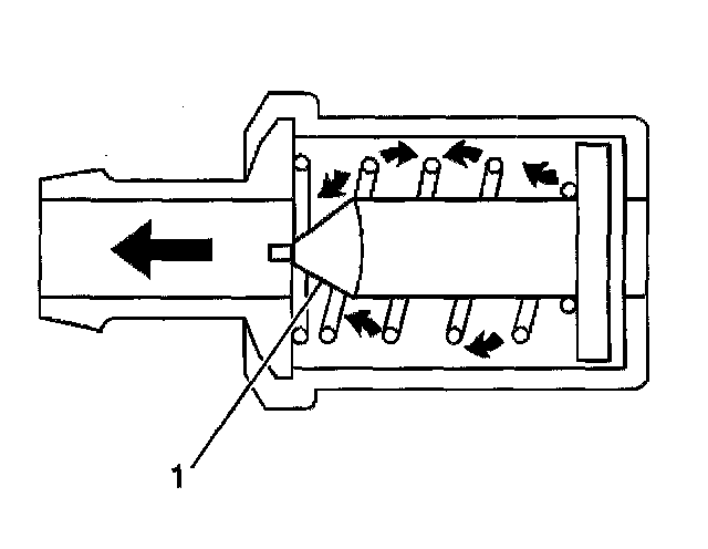 The primary control is through the crankcase ventilation valve (1) which meters the flow at a rate depending on inlet vacuum. To maintain idle quality, the crankcase ventilation valve restricts the flow when inlet vacuum is high. If abnormal operating conditions arise, the system is designed to allow excessive amounts of blow-by gases to back flow through the crankcase vent into the throttle body to be consumed by normal combustion.