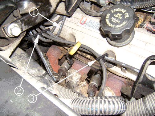 1. Install a 7 mm two-wire retainer, P/N 12132229 (Qty 10/pack) to spark plug wires 3 and 5 only (1). Save the other 7mm spark plug two-wire retainers for future repairs.