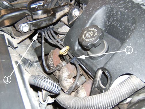 2. Install the 7 mm four-wire retainer, P/N 88891792 to spark plug wire number 4 (1) then to spark plug wires 1, 3 and 5 (2). Make sure that spark plug wires 2, 4 and 6 are secured to the original retainers and under the left engine mount strut bracket.