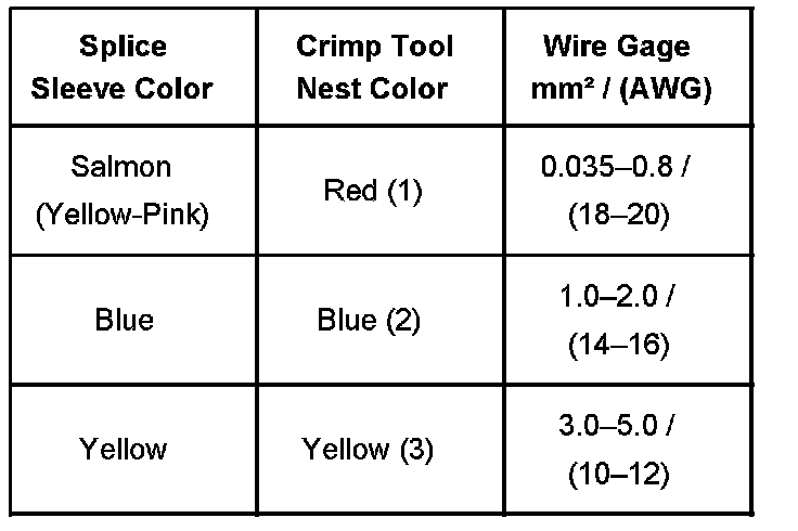 4. Select the proper sealed splice sleeve according to the wire size. Refer to the table at the beginning of the repair procedure for the color coding of the splice sleeves and the crimp tool nests.