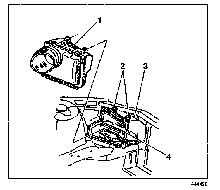 1. Install the air cleaner housing by pushing the housing (1) into the 2 rubber grommets (2) in the engine compartment.