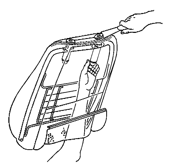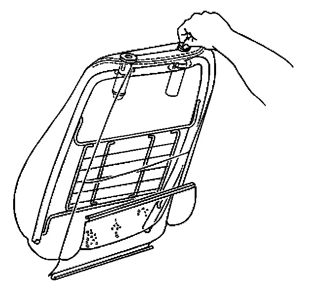 5. Reach carefully inside the front seat back between the seat back cover and the seat back pad and squeeze the bottom of the head restraint retainer together, while pulling the head restraint retainer upwards from the seat back frame with the other hand.