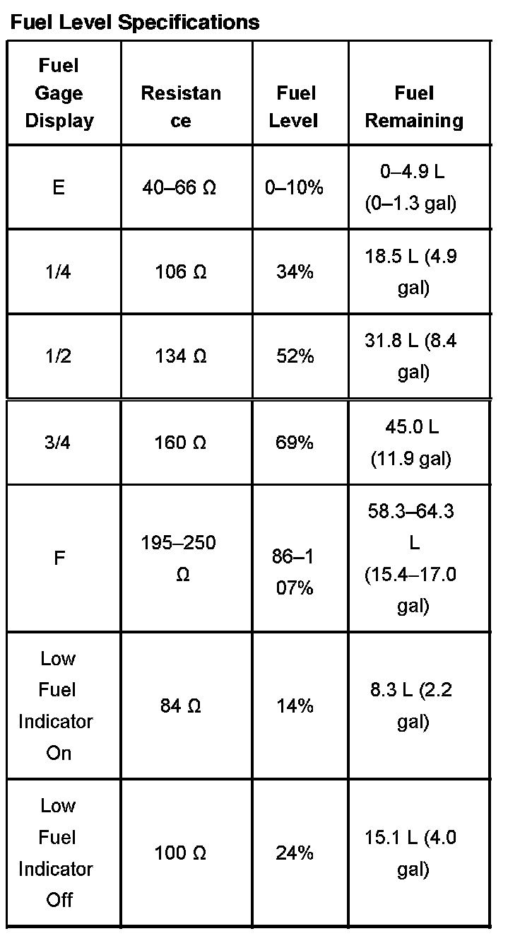 FUEL LEVEL SPECIFICATIONS