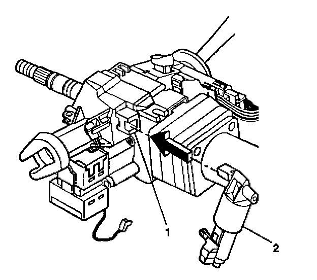 7. Remove the steering wheel theft deterrent lock (2) from the ignition lock cylinder case assembly (1).
