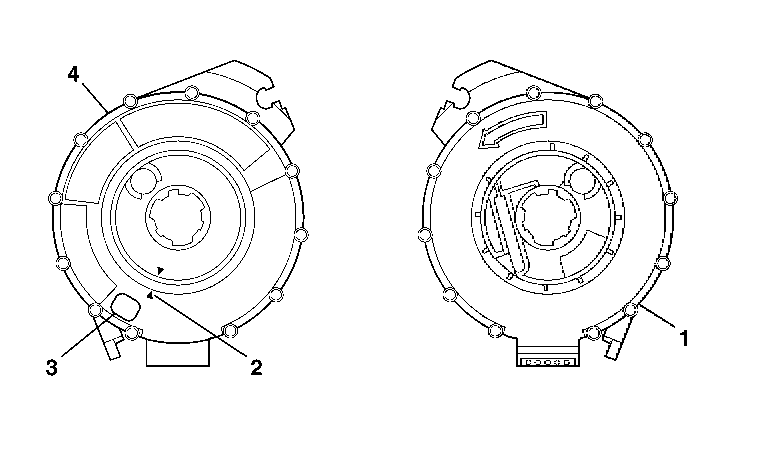 3. If the front (4) of the SIR coil has a centering window (3), and the back side (1) includes NO spring service lock, perform the following steps: